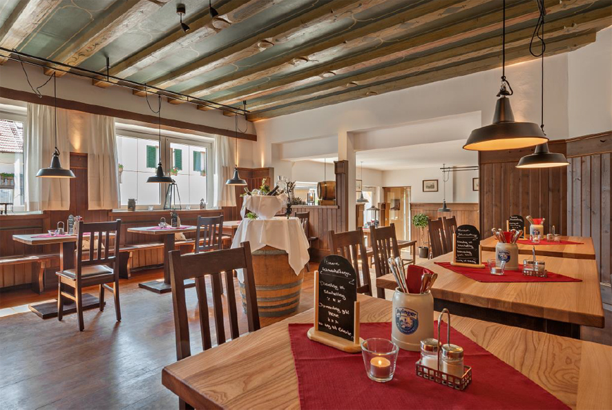 Im Erdgeschoss befindet sich das Restaurant mit Eingangsbereich und drei Gasträumen. Die sehr gepflegten Gasträume sind mit Einbaueckbänken, Holzstühlen und Tischen 2013 komplett neu eingerichtet worden. Sie bieten Platz für ca. 90 Gäste.