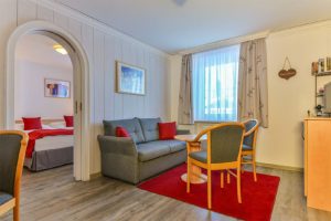 Im ersten und zweiten Stock gibt es insgesamt 10 Doppelzimmer und Suiten mit eigenem Bad, teilweise mit Südost Balkon. Die hellen Zimmer sind bequem eingerichtet und gut ausgestattet.