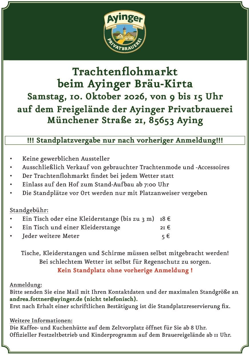 Trachtenflohmarkt am 10. Oktober 2026 - Anmeldung per Email an brauerei@ayinger.de